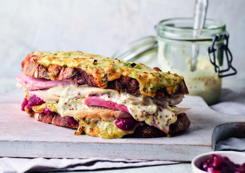 1 EL Mayonnaise und ½ EL Senf verrühren. Ein Cranberry-Käse-Brot mit Hähnchen belegen und mit Senfmayonnaise bestreichen. Die zweite Brotscheibe mit der Käseseite nach oben auflegen.