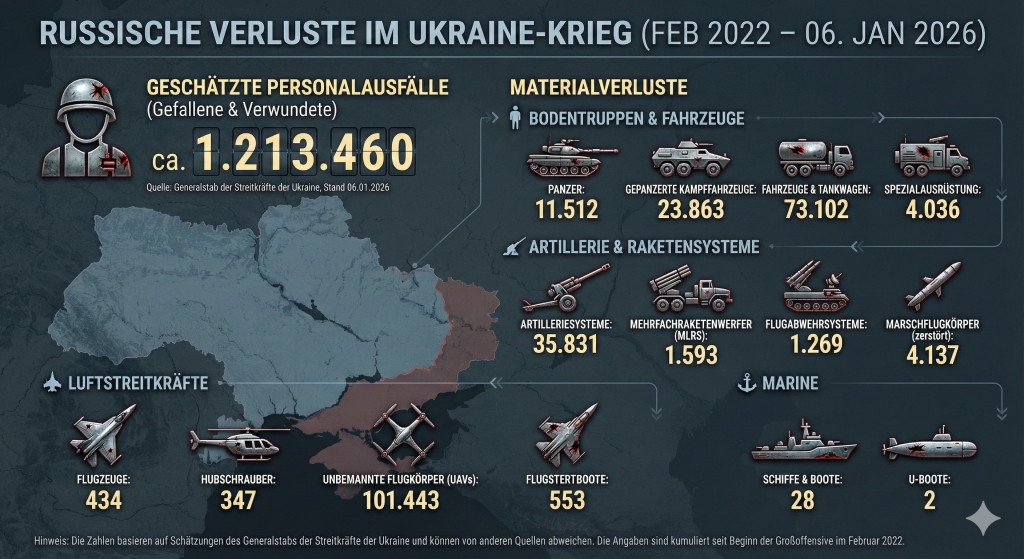 Denn wie der Generalstab der ukrainischen Streitkräfte am Dienstag, dem 6. Januar 2026, auf Facebook mitteilte, soll die russische Armee innerhalb eines Tages knapp 1.000 weitere Soldaten bei den Kampfhandlungen verloren haben. Die Rede ist von 940 getöteten oder verwundeten Männern in den vergangenen 24 Stunden. Seit Beginn des Ukraine-Kriegs am 24. Februar 2022 seien insgesamt bereits 1.213.460 russische Soldaten gefallen oder schwer verwundet worden. Wie nah diese Zahlen der Realität kommen, bleibt jedoch unklar. Der Kreml veröffentlicht keine Zahlen zu den eigenen Verlusten. Zudem muss berücksichtigt werden, dass auch Kiew im Konflikt Propagandamittel einsetzen könnte, um den Feind in ein möglichst schlechtes Licht zu rücken.
