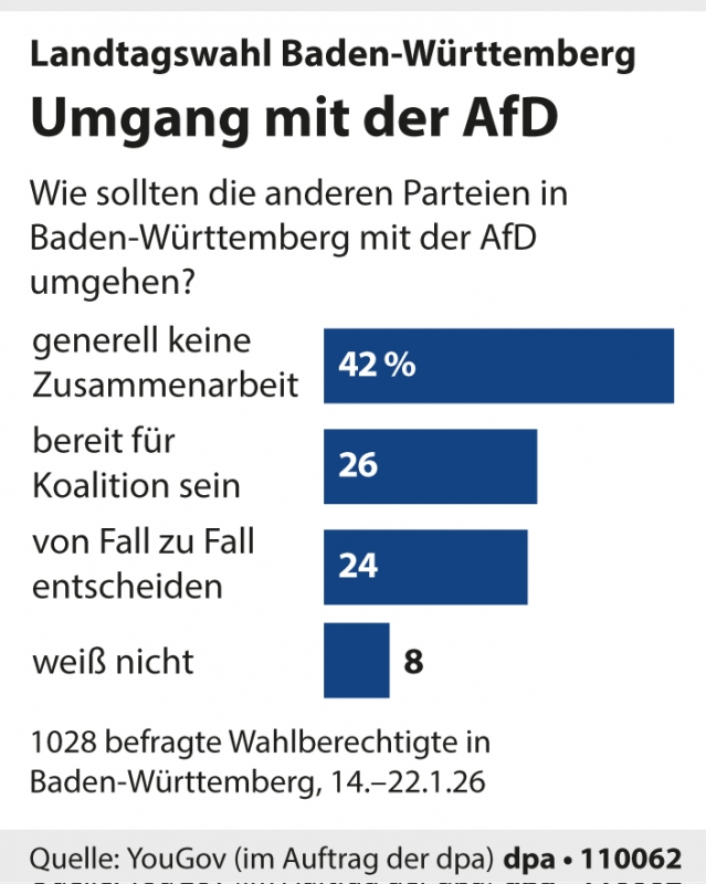 Die Unterstützung für die strikte Abgrenzung gegenüber der AfD ist im Südwesten den Umfrageergebnissen zufolge hingegen geschrumpft. Lediglich 42 Prozent der Wahlberechtigten lehnen jegliche Form der Zusammenarbeit ab. Acht Prozent äußerten keine Meinung zu dieser Frage.