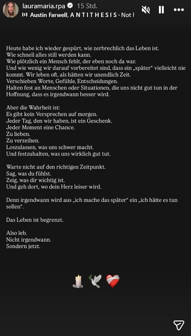 Ihren Fans riet Laura außerdem, nicht "auf den richtigen Zeitpunkt" zu warten, zu sagen, was man fühlt, und zu zeigen, was einem wichtig ist. "Und geh dort hin, wo dein Herz leiser wird." Zum Abschluss ihres Posts wies die Influencerin noch einmal darauf hin, dass das Leben begrenzt ist und man deshalb "jetzt" leben sollte. Außerdem fügte sie drei Emojis hinzu: eine Kerze, eine weiße Taube sowie ein mit Verband umwickeltes Herz.