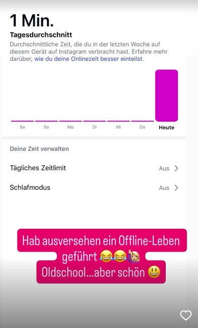 Daniela befand sich zuletzt auf Social-Media-Entzug, wie sie in ihrer Instagram-Story klarstellte. Sie postete einen Screenshot ihres Zeitmanagements. Das Ergebnis: Im Durchschnitt hat der Reality-Star in der vergangenen Woche nur eine Minute pro Tag auf seinem Handy bei Instagram verbracht. Von Sonntag bis Donnerstag blieb sie der Plattform sogar komplett fern. "Hab aus Versehen ein Offline-Leben geführt. Oldschool ... aber schön", kommentierte sie ironisch und fügte lachende Emojis hinzu. Die Trennung von der Social-Media-Welt scheint ihr also sehr gutgetan zu haben.