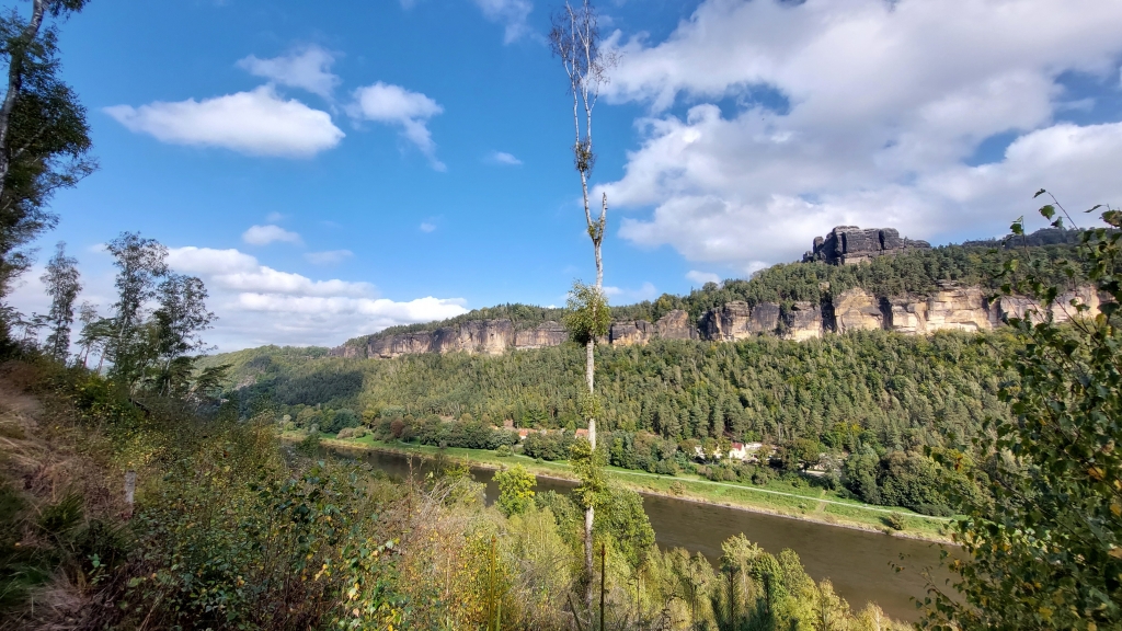 Der zweite Teil des Weges führt sanft über ruhige Straßen und idyllische Dörfer sowie über Wald- und Wiesenwege. Hier sieht man die Sächsische Schweiz noch einmal von einer ganz anderen Seite. Ebenfalls wunderschön ruhig ist das letzte Teilstück durch den Wald, das zum Ende steil bergab zurück zum Startpunkt in Krippen führt.