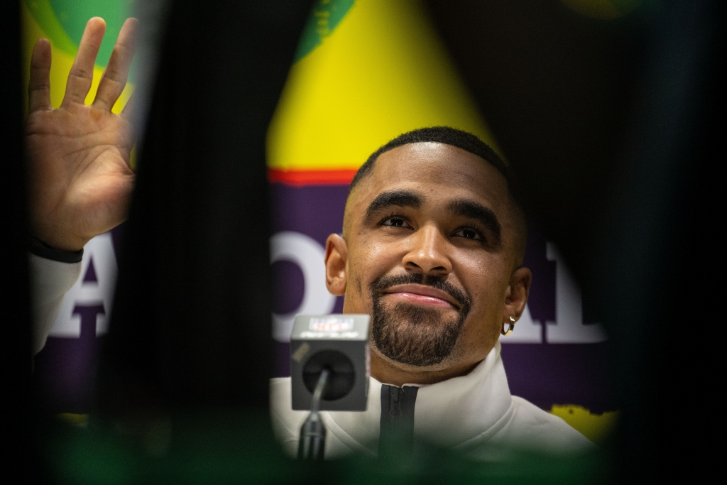 Jalen Hurts von den Philadelphia Eagles grinst bei einem Interview, am 03.02.2025. (Symbolbild) Bild: picture alliance/dpa | Maximilian Haupt
