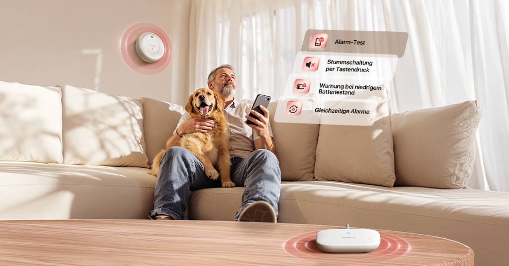 Während der Deckenmelder einen 85-dB-Alarm auslöst, ertönt an der SBS50-Basisstation gleichzeitig ein 100-dB-Warnsignal. Noch bevor Sie den Rauch bemerken, erhalten Sie eine Push-Benachrichtigung direkt auf Ihr Smartphone – für maximale Sicherheit, selbst wenn Sie nicht zu Hause sind.